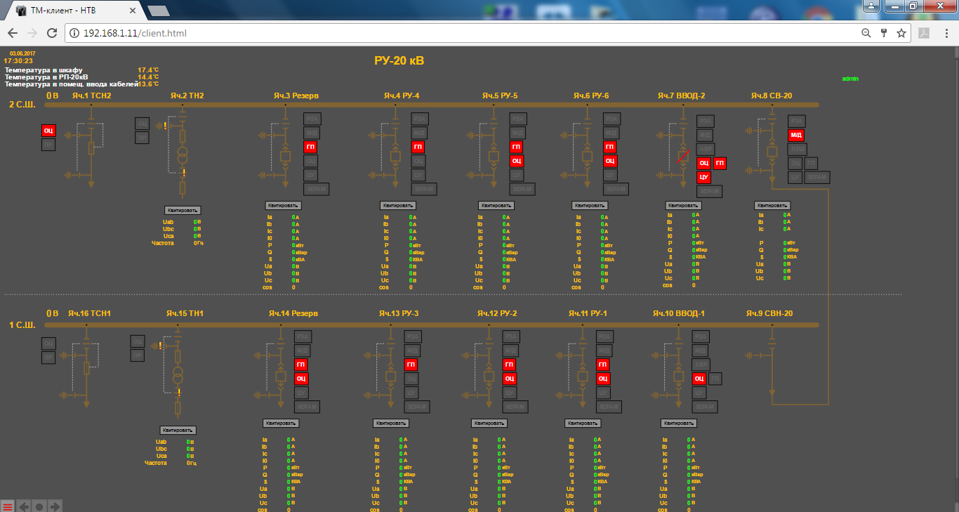 Помимо основного оборудования РУ-20кВ осуществляется мониторинг работы ИБП собственных нужд подстанции, шкафов СН ШПСН-В и ЩАП, осуществляется контроль доступа в РУ-20кВ (концевые выключатели дверей) и температуры окружающего воздуха внутри помещений.