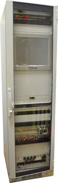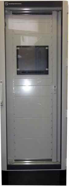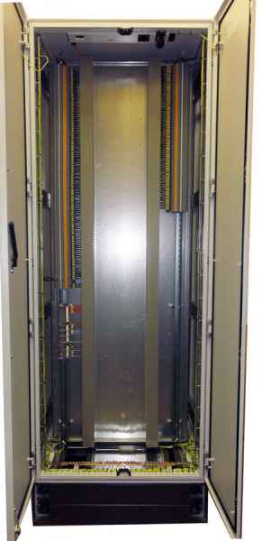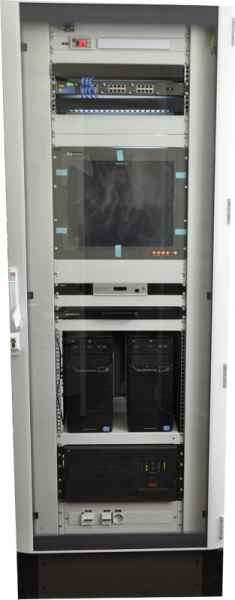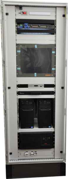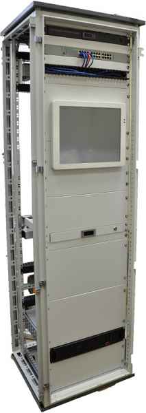 Серверные шкафы, как правило, имеют форм-фактор 19", но могут иметь ширину 600 и 800мм. В состав шкафа входит вентиляторная панель, KVM консоль, выдвижная клавиатура, панельный монитор и сервера различного форм-фактора.