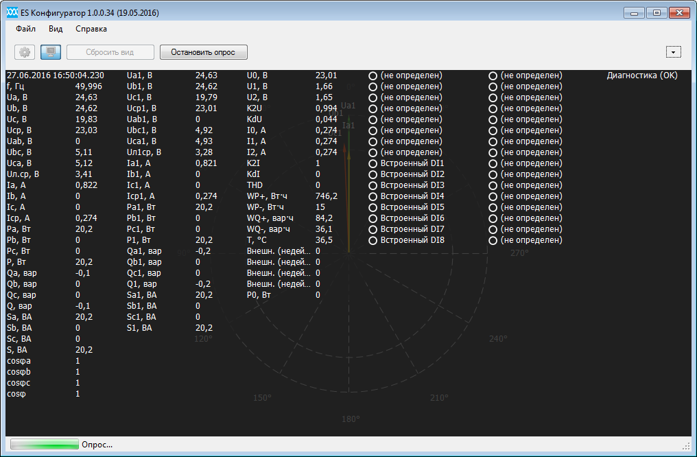 фазная и суммарная мощность нагрузки — активная, реактивная, полная;
